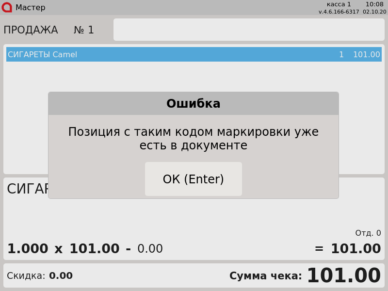 777 - Позиция с таким кодом маркировки уже есть в документе.png