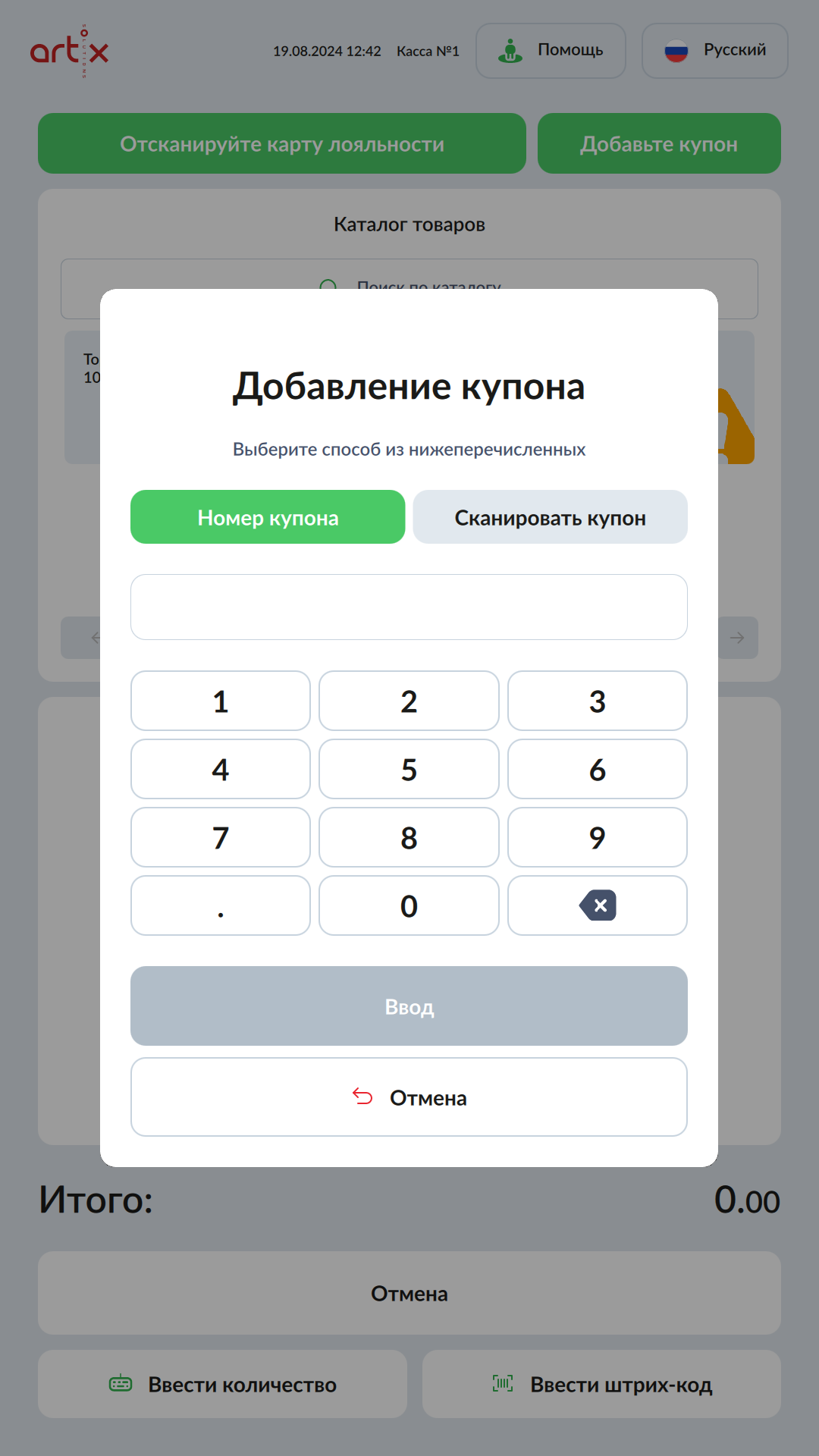 7 - Artix SCO. Новый интерфейс. Добавление карты купона в чек. Сканированием штрих-кода.png