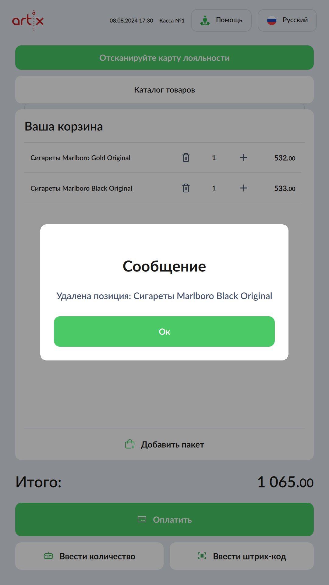 7 - Artix SCO. Новый интерфейс. Сторнирование табачной продукции. Удалена позиция другого товара в чеке.png