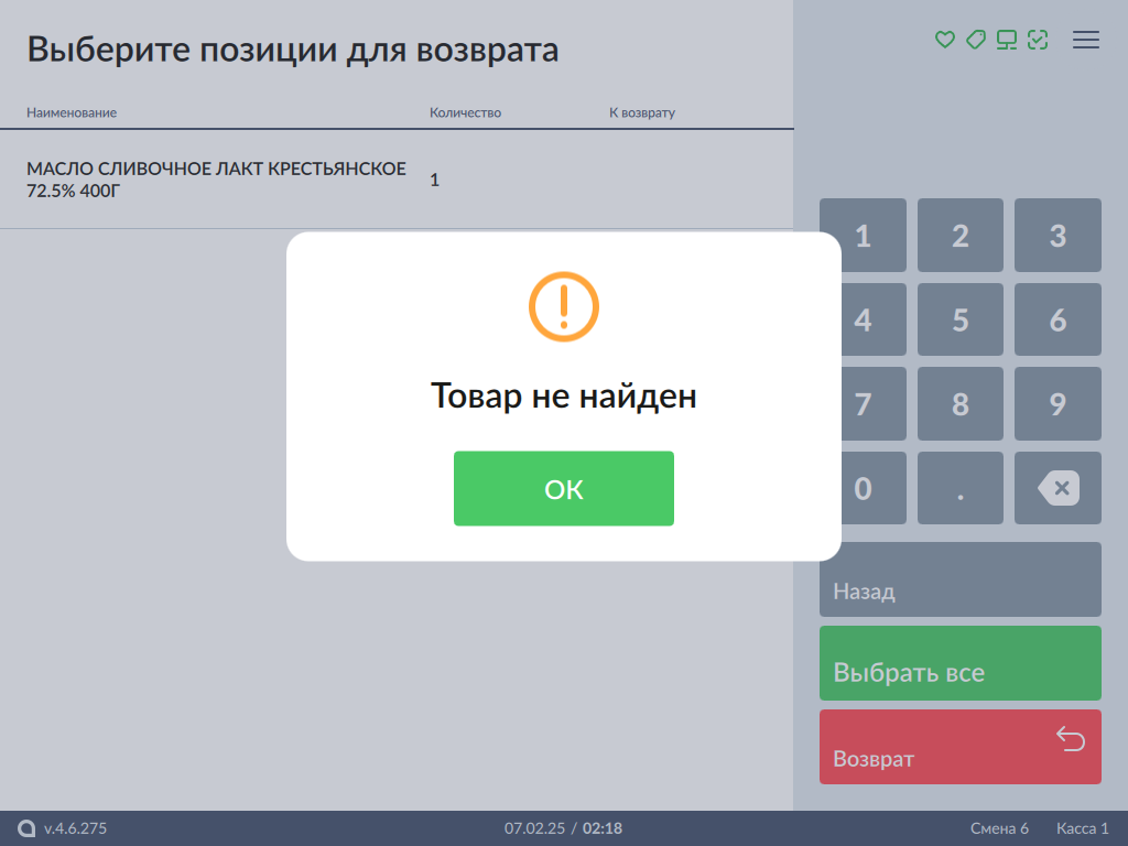 23-Возврат по чеку. Выбор сканером.Товар не найден.png