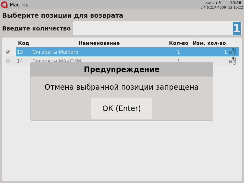 7 - Возврат табачной продукции. Возврат по чеку продажи. Отмена выбранной позиции запрещена.png