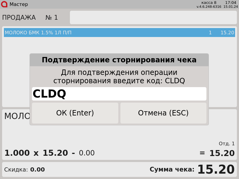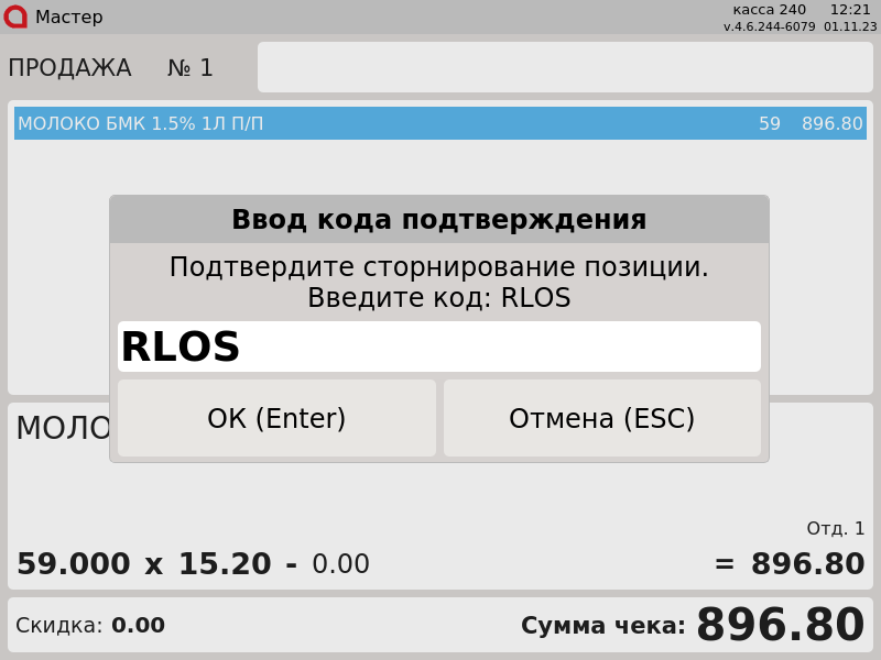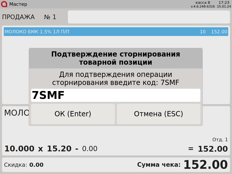 7 - Сторнирование товара. Сторнирование всех позиций чека с вводом кода подтверждения.png