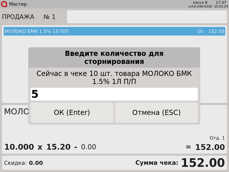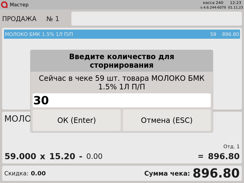 7 - Сторнирование товара. Сторнирование позиции, добавленной не по штрих-коду + количество товара для сторнирования.png