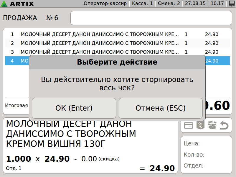 599 - Artix POS 5.0. Сторнирование товара. Сторнирование чека. Диалог.png