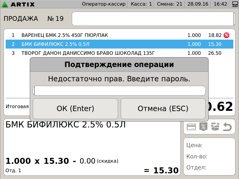 599 - Artix POS 5.0. Сторнирование товара. Сторнирование всех позиций чека с вводом кода подтверждения.png