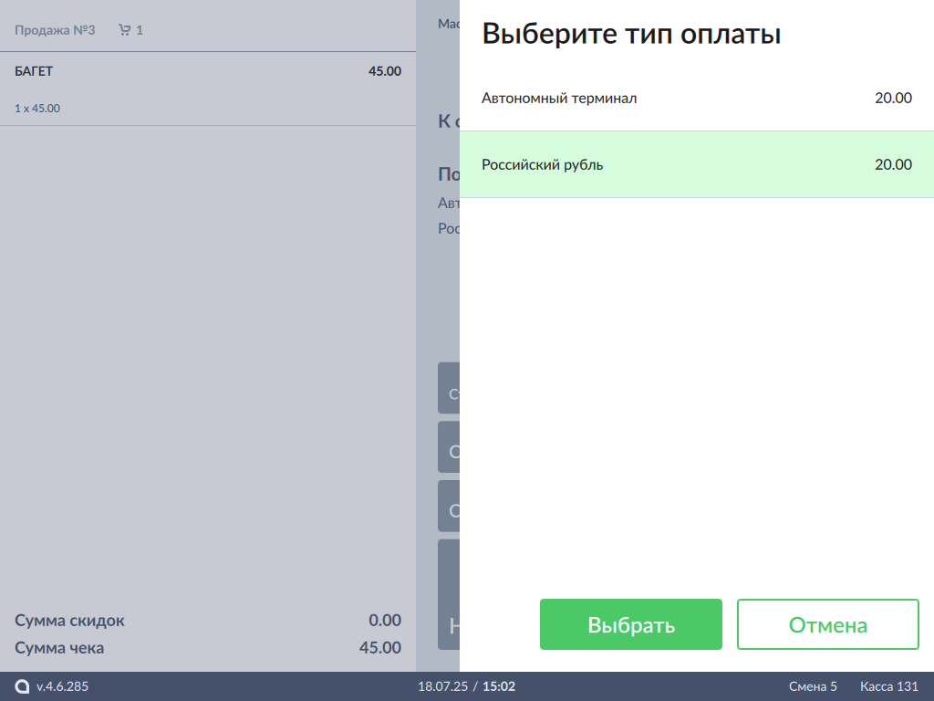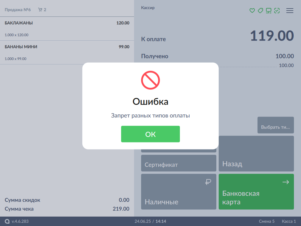 23-Touch. Оплата чека продажи. Запрет разных типов оплаты.png