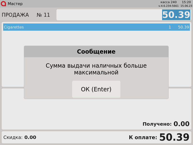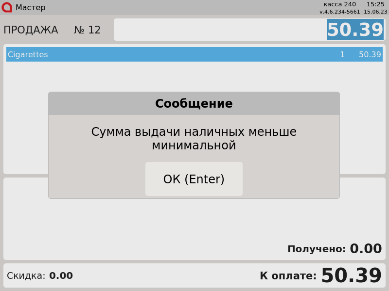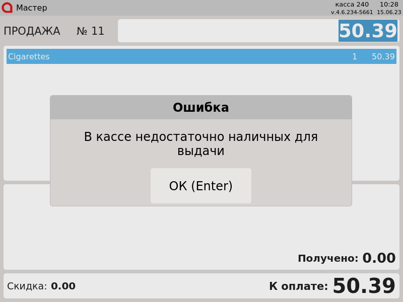 23-Новый интерфейс. Выдача наличных. В кассе недостаточно наличных.png
