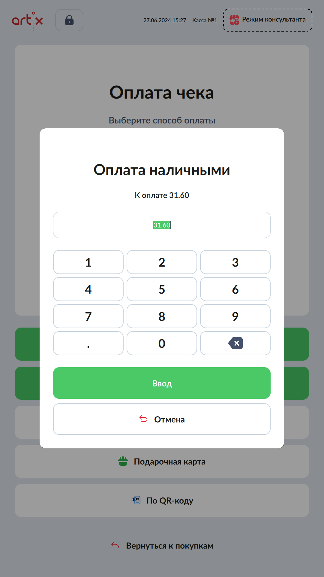 7 - Artix SCO. Новый интерфейс. Продажа товаров на КСО. Оплата наличными. Ввод суммы наличных.png