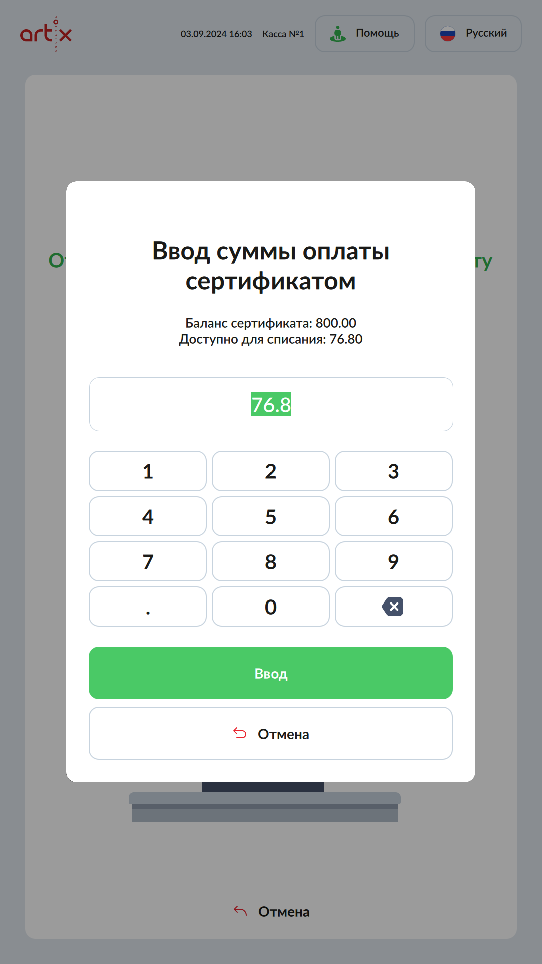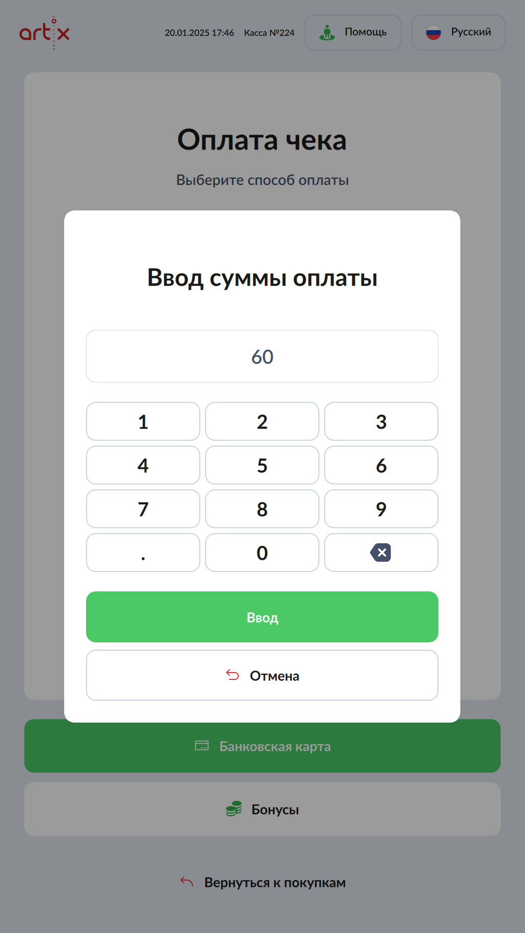 23- Artix SCO. Новый интерфейс. Продажа товаров на КСО. Оплата наличными. Ввод суммы наличных.png