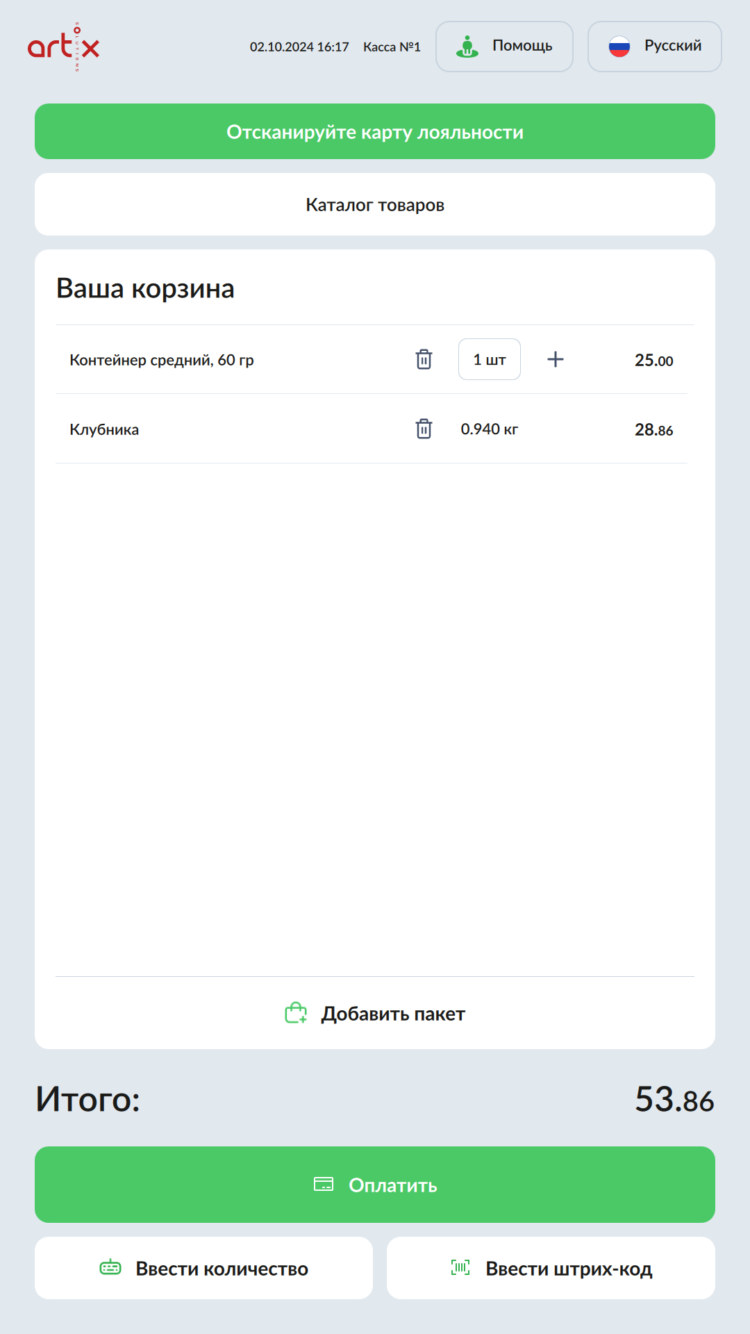 7 - Весовые товары с выбором упаковки. Товар и упаковка добавлены в чек.png