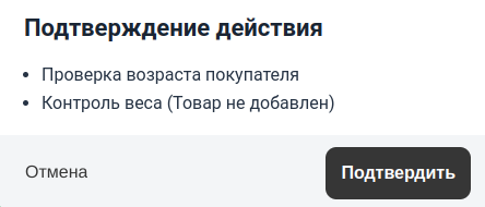 Если на КСО используются контрольные весы, то после изменения количества возникнет ошибка контроля веса. В этом случае необходимо подтверждение консультантом. |